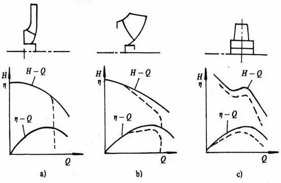 對(duì)于低比轉(zhuǎn)速,由于葉片間流道窄而長(zhǎng),一旦發(fā)生汽蝕,氣泡充滿整個(gè)流道,性能曲線會(huì)突降。