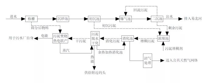 chania污水處理廠位于希臘克里特島干尼亞州市中心東部幾公里處,至2017年服務(wù)人口為17萬人,處理水量19 400 m3/d;進(jìn)水水質(zhì):cod=869 mg/l,tn=50 mg/l,tp=8.4 mg/l 。該廠采用傳統(tǒng)活性污泥法作為主流工藝,不設(shè)額外除磷設(shè)施。剩余污泥厭氧消化后產(chǎn)沼氣并熱電聯(lián)產(chǎn)。污水、污泥處理/處置全工藝流程如圖4所示。