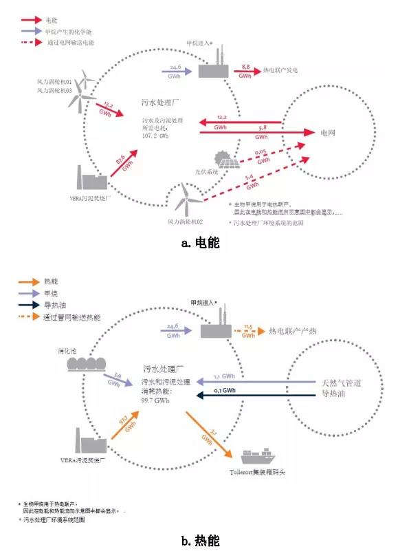 k?hlbrandh?ft/dradenau污水處理廠對剩余污泥進(jìn)行厭氧消化,同時收集廠外生物廢棄物與污泥共消化以增加沼氣產(chǎn)量,并實(shí)現(xiàn)沼氣轉(zhuǎn)換為天然氣對外輸送。后續(xù)消化熟污泥施以焚燒處置,進(jìn)一步熱電聯(lián)產(chǎn)回收電能和熱能;電能彌補(bǔ)自身電耗使用,熱能則被輸送至污泥干化設(shè)備,可完全滿足高溫干化需要;污泥干化后的低溫余熱可繼續(xù)供消化池保溫使用。如此設(shè)計,可實(shí)現(xiàn)電能與熱能高效回收利用。此外,自2009年起該廠富余熱能還向附近碼頭輸出供應(yīng)。圖3為該廠2018年電能與熱能流向示意圖。該廠污泥焚燒產(chǎn)能遠(yuǎn)遠(yuǎn)大于沼氣熱電聯(lián)產(chǎn),且應(yīng)用太陽能、風(fēng)能等清潔能源,實(shí)現(xiàn)能源回收的同時進(jìn)一步減少co2排放。2018年該廠總電耗為107.2 gw·h/a,產(chǎn)電量為115 gw·h/a,電能自給率達(dá)107%;總熱耗為99.7 gw·h/a,產(chǎn)熱量為113 gw·h/a,熱能自給率達(dá)113%??梢?,該廠通過自身進(jìn)水中高濃度有機(jī)物(cod=850 mg/l)、外源有機(jī)廢棄物、太陽能、風(fēng)能等綜合利用,已超越能源中和目標(biāo)并可向外供氣(ch4)和熱。預(yù)計未來該廠將達(dá)到發(fā)電量大于耗電量的30%,熱能供應(yīng)范圍也將進(jìn)一步擴(kuò)大。
