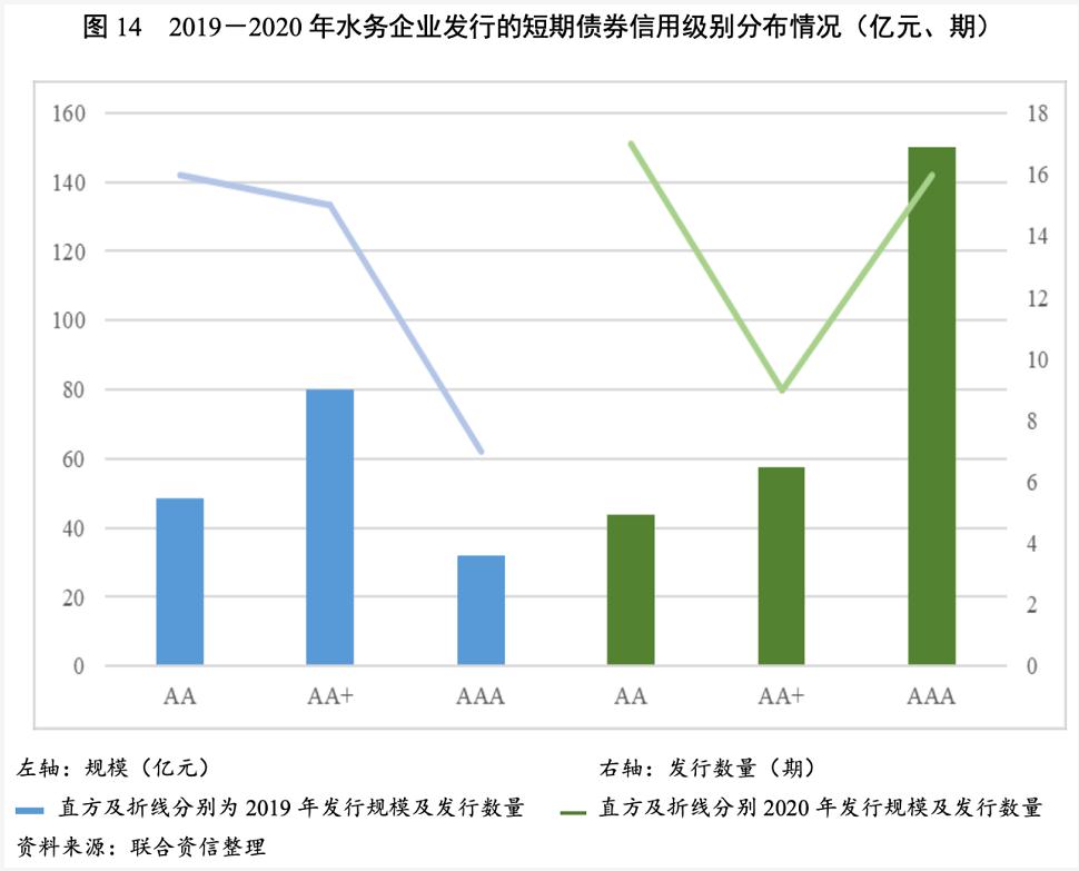 從短期融資券發(fā)行規(guī)模來看,2020年,aa+級水務企業(yè)所發(fā)短期融資券規(guī)模占比下降至24.12%,aa級水務企業(yè)所發(fā)短期融資券規(guī)模占比下降至18.23%,短期融資券發(fā)行規(guī)模呈現(xiàn)向aaa級集中的趨勢。