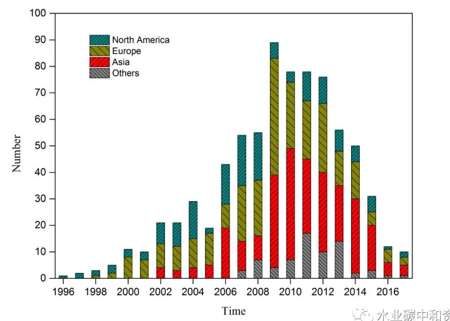 國際權(quán)威mbr應(yīng)用網(wǎng)對世界范圍內(nèi)近20年來700余座大型mbr污水處理廠應(yīng)用情況進行了逐年統(tǒng)計,并繪制了如圖2所示的mbr工程應(yīng)用趨勢。本課題組也統(tǒng)計世界范圍內(nèi)大型mbr項目(表2)。可以看到,進入21世紀后,mbr技術(shù)首先在北美和歐洲獲得青睞,新增項目也都集中在這兩個區(qū)域。隨后,亞洲和其它地區(qū)(主要為澳洲?北非)迅速跟進。mbr工程應(yīng)用在2009~2012年間達到鼎盛時期;然而,從2013年開始mbr工程應(yīng)用出現(xiàn)大幅回落,直至近兩年應(yīng)用數(shù)量只有鼎盛時期10%。