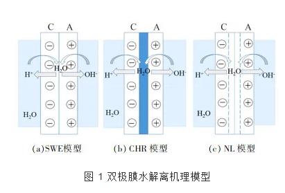 然而雙極膜中發(fā)生的水解離現(xiàn)象不同于通常的水解離,研究者們對(duì)其解離的過(guò)程機(jī)理開(kāi)展了大量的理論研究,但限于過(guò)程的復(fù)雜性,目前還沒(méi)有達(dá)成統(tǒng)一的結(jié)論。根據(jù)水在雙極膜中間層解離過(guò)程的不同,主要提出3種解釋水解離機(jī)制的物理模型,見(jiàn)圖 1。