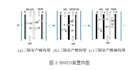 bpm與aem、cem組成的bmed的裝置構(gòu)型從簡(jiǎn)單的二隔室發(fā)展為三隔室,由b-c-b或者b-a-b組合成的二隔室和由b-a-c-b構(gòu)成的三隔室bmed。見(jiàn)圖 2。