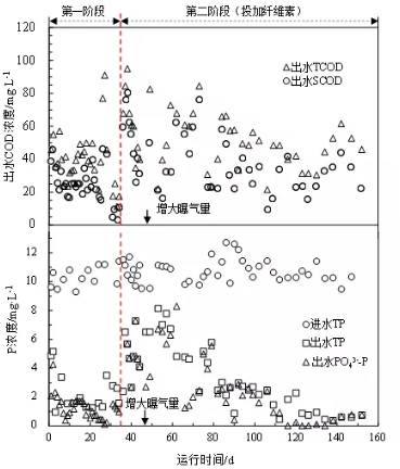 2.1 纖維素對cod與p去除的影響圖2顯示了小試裝置在整個試驗期間出水cod與磷濃度變化。在第一階段進水tcod濃度維持在450 mg/l時,出水tcod平均為(39.7±16.1)mg/l,其中scod為(24.8±10.8) mg/l,符合國家一級a排放標(biāo)準(zhǔn)。然而,當(dāng)?shù)诙A段加入纖維素后,cod去除效果明顯惡化,出水tcod最高檢測值高達95 mg/l(scod為80 mg/l)。為探究加入纖維素后cod去除效果惡化原因,對出水tcod的構(gòu)成進行了分析。結(jié)果顯示,加入纖維素后出水ss顯著下降,從(48.25±3.29) mg/l降至(21.34±9.71) mg/l,由此可排除污泥沉降性能惡化導(dǎo)致出水cod升高問題。纖維素富含官能團且呈線狀,因此其對污泥具有較好網(wǎng)捕卷掃作用,可促進污泥絮體凝結(jié)并提高其緊密度,這一現(xiàn)象通過污泥鏡檢也得到了印證。然而,不論是因纖維素自身作為cod消耗氧氣,還是導(dǎo)致污泥絮體變得緊密都有可能降低氧傳質(zhì),從而弱化了對cod的降解效率。為此,在第46 天對好氧池運行進行調(diào)整,將曝氣量提高至0.30~0.50 l/min(添加纖維素前為0.10~0.20 l/min)。結(jié)果,出水cod開始逐漸下降并恢復(fù)至投加纖維素前水平(tcod=49.4 mg/l,scod=34.2 mg/l)。可見,回收纖維素對曝氣池運行有著積極影響,可提高氧氣傳質(zhì)與利用效率。