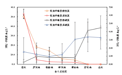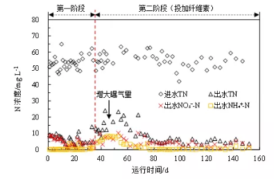 與此同時,纖維素投加對磷去除的影響與cod類似,在纖維素投加初期(第36~50 天),出水總磷(tp)和正磷酸鹽(po3-4-p)濃度均開始惡化,去除率分別降低至51.99%和56.32%。從發(fā)生原因來看,do不足是導(dǎo)致磷去除效率下降的主因,可以從增大曝氣量后出水tp逐漸下降得到驗證。然而,出水tp含量在提高曝氣量后的很長一段時間內(nèi)也沒有恢復(fù)至投加纖維素前水平,而是保持在(2.86±1.22) mg/l左右。為進一步分析其原因,在第68 天從曝氣池末端取混合樣進行了聚磷菌(paos)活性測定,并與投加纖維素前的活性進行了對比。結(jié)果顯示,投加纖維素后,反應(yīng)器中paos比釋磷速率和比吸磷速率分別為11.3 和12.0mg/(gvss?h),與投加前的10.8 、13.4 mg/(gvss?h)相比變化并不是很大。可見,纖維素的投加對paos活性的影響并不大。因此,反應(yīng)器除磷效果恢復(fù)較慢的原因可能與纖維素投加初期導(dǎo)致的跑泥和生物量恢復(fù)較慢有關(guān)。2.2 纖維素對氮去除的影響圖3顯示了在投加纖維素前后裝置對氮去除效果的變化。從整體上看,反應(yīng)器無論是否投加纖維素均能夠很好地完成脫氮,投加前出水tn、nh4+-n和 no3--n平均濃度分別(5.9±3.1)、(0.40±0.96)(4.59±2.22)mg/l,投加后為(7.80±5.46)、(1.30±2.00)、(4.11±2.22) mg/l。只是在纖維素投加初期,出水tn出現(xiàn)明顯惡化,此時出水中nh4+-n明顯增多,這顯然與上述氧傳質(zhì)受限有關(guān)。圖3顯示,在增大曝氣量后對tn的去除效率迅速恢復(fù),主要是因為硝化能力開始恢復(fù)。