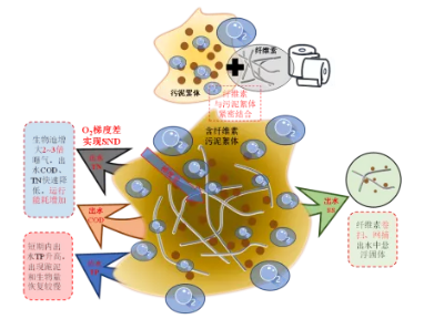 2.3 纖維素對運行的影響纖維素對反應(yīng)器運行影響是兩方面的,似乎均與其對污泥絮體致密程度有關(guān)。圖6總結(jié)了纖維素對反應(yīng)器運行、能耗等方面的影響及其機理。纖維素通過自身線狀形態(tài)和官能團可靠網(wǎng)捕卷掃作用將污泥絮體密實包裹,相當(dāng)于促進絮凝,可降低出水ss以及其中所含n、p。