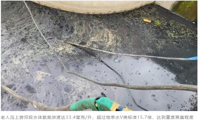 督察組前期暗訪發(fā)現(xiàn),老人溝沿江平路2公里長的河段水體明顯發(fā)黑發(fā)臭,氨氮濃度最高為33.4毫克/升,超過地表水v類標(biāo)準(zhǔn)的15.7倍,達(dá)到重度黑臭程度。進(jìn)一步排查發(fā)現(xiàn),河道沿線排污納管仍不徹底,存在7個(gè)生活污水直排口。其中,距入槐泗河口約200米處的一處污水井大量溢流,采樣監(jiān)測結(jié)果顯示,外排污水化學(xué)需氧量、氨氮濃度分別高達(dá)136毫克/升、46.0毫克/升;江陽家園西側(cè)排口排水氨氮濃度達(dá)到34.0毫克/升。老人溝上游段新建的提升泵站污水溢流入河,外排污水化學(xué)需氧量、氨氮濃度分別達(dá)到82毫克/升、19.4毫克/升。