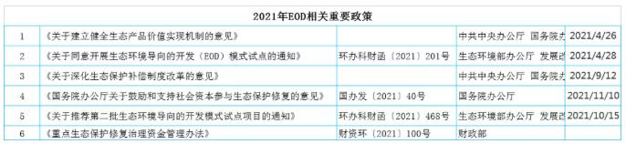 2021年,從政策層面的進(jìn)一步明確到試點(diǎn)推進(jìn)的不斷加深,eod模式落地加速。根據(jù)環(huán)境商會觀察,一是2021年全年,相關(guān)政策陸續(xù)發(fā)布,對eod的支持力度加大。