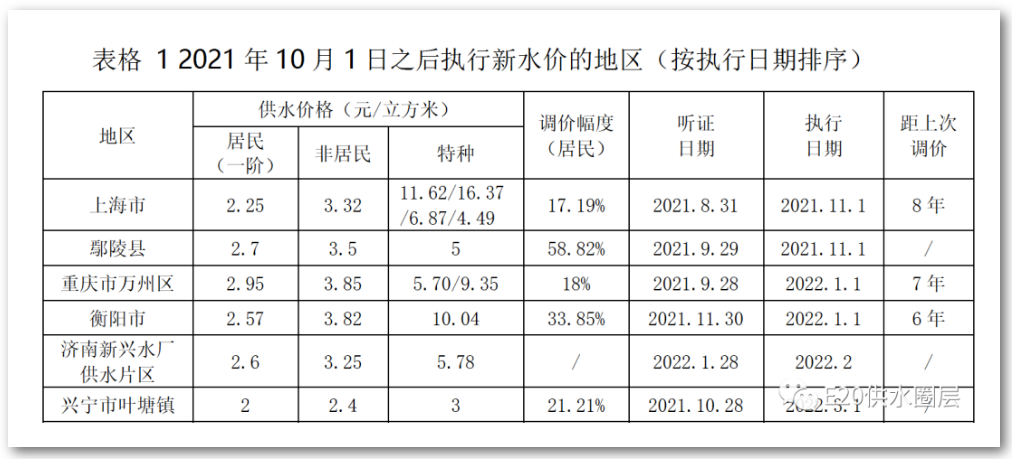 上海市、重慶市萬(wàn)州區(qū)由于聽(tīng)證時(shí)間早于2021年10月1日,所以價(jià)格制定仍按照舊版管理辦法執(zhí)行,葉塘鎮(zhèn)雖然聽(tīng)證會(huì)晚于10月1日,但是從其價(jià)格方案可看出仍按舊版規(guī)定設(shè)置價(jià)格水平,濟(jì)南鋼城區(qū)新興水廠片區(qū)本次調(diào)整目的為將片區(qū)水價(jià)與全區(qū)水平相統(tǒng)一。