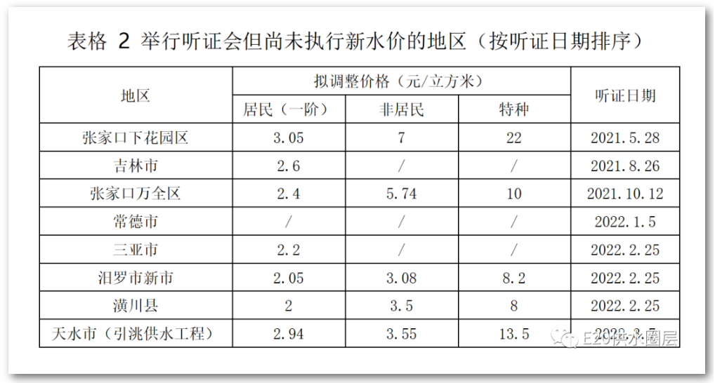 除了上述已執(zhí)行新水價(jià)的地區(qū)外,據(jù)不完全統(tǒng)計(jì),有6個(gè)地區(qū)在10月1日之后舉行了聽(tīng)證會(huì),預(yù)計(jì)近期將執(zhí)行新水價(jià)。另有張家口下花園區(qū)和吉林市聽(tīng)證時(shí)間早于10月1日,但至今仍未執(zhí)行新價(jià)格。具體價(jià)格信息可見(jiàn)表2。