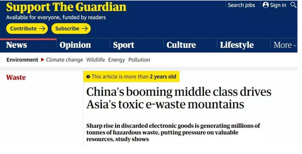 早在2年前,英國《衛(wèi)報》曾刊登了一篇標(biāo)題為“中國興盛的中產(chǎn)階級正在導(dǎo)致亞洲的有害電子垃圾堆積如山”的文章,稱中國是導(dǎo)致亞洲有害電子垃圾快速增長的主要因素。還宣稱,由于電子設(shè)備的生產(chǎn)本身就會對環(huán)境資源有很大的消耗,所以回收這些電子垃圾非常重要。但由于缺乏有效的環(huán)境管理政策,缺乏對電子材料的回收,電子垃圾所帶來的問題變得越來越嚴(yán)峻。
